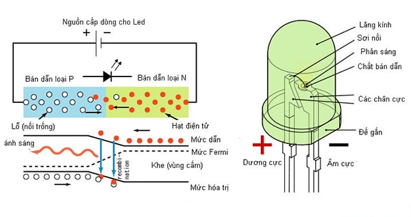 "LED (viết tắt của Light Emitting Diode hay điốt phát quang) là các điốt có khả năng phát ra ánh sáng hay tia hồng ngoại, tử ngoại. Cũng giống như điốt, LED được cấu tạo từ một khối bán dẫn loại p ghép với một khối bán dẫn loại n". Chip led được gắn lại với nhau nhằm nâng cao khả năng phát ánh sáng. Ba loại tổ hợp phổ biến hiện này là : DIP, SMD và COB.